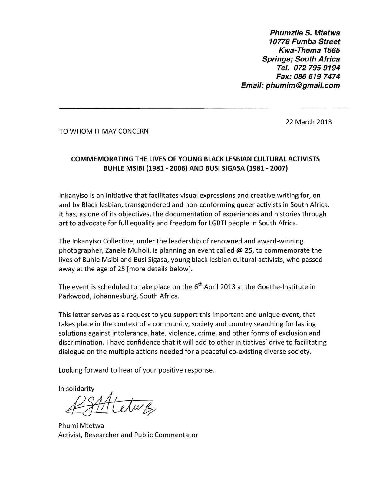 On 21st March 2013, Inkanyiso sent out invitation letters and call for help to different organisations to host @25 event to commemoration the lives of Busi Sigasa & Buhle Msibi. Some responded to the call by sending letters of support. Others pretended to be confused by the request for letters of support.