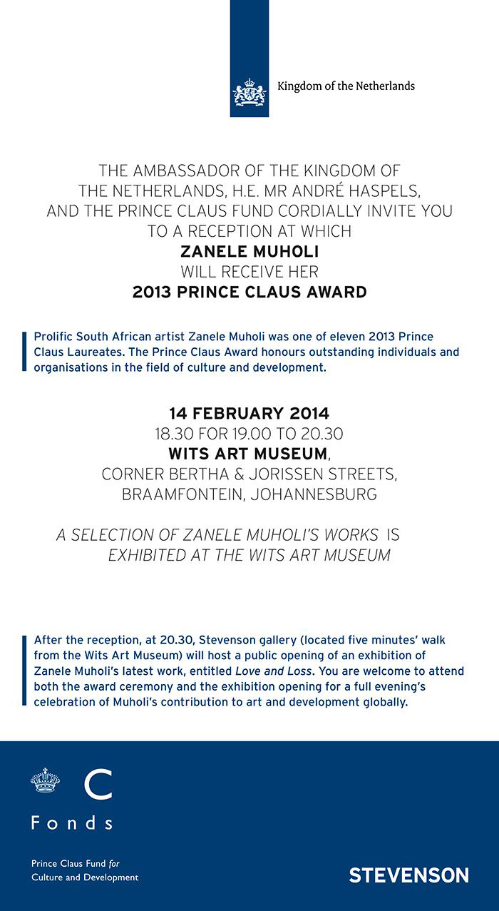 On a global scale, Muholi is 1 of 11 global laureates, and the first black lesbian from Africa to receive this prestigious award. In a closed ceremony that will be attended by an Amsterdam ambassador, Ms Fariba Derakshani, whom will also give a key note today, 14th February 2014 at Wits Art Museum, Braamfontein, Johannesburg.
