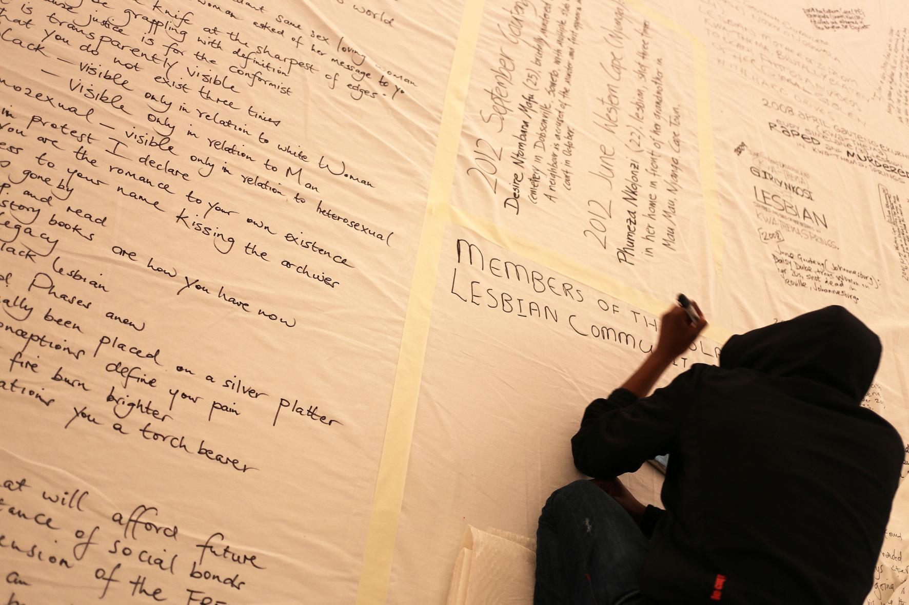 A white cloth inscribed with testimonies will also cover a section of Muholi’s exhibition room, it features quotes on hate crime survivors and victims.