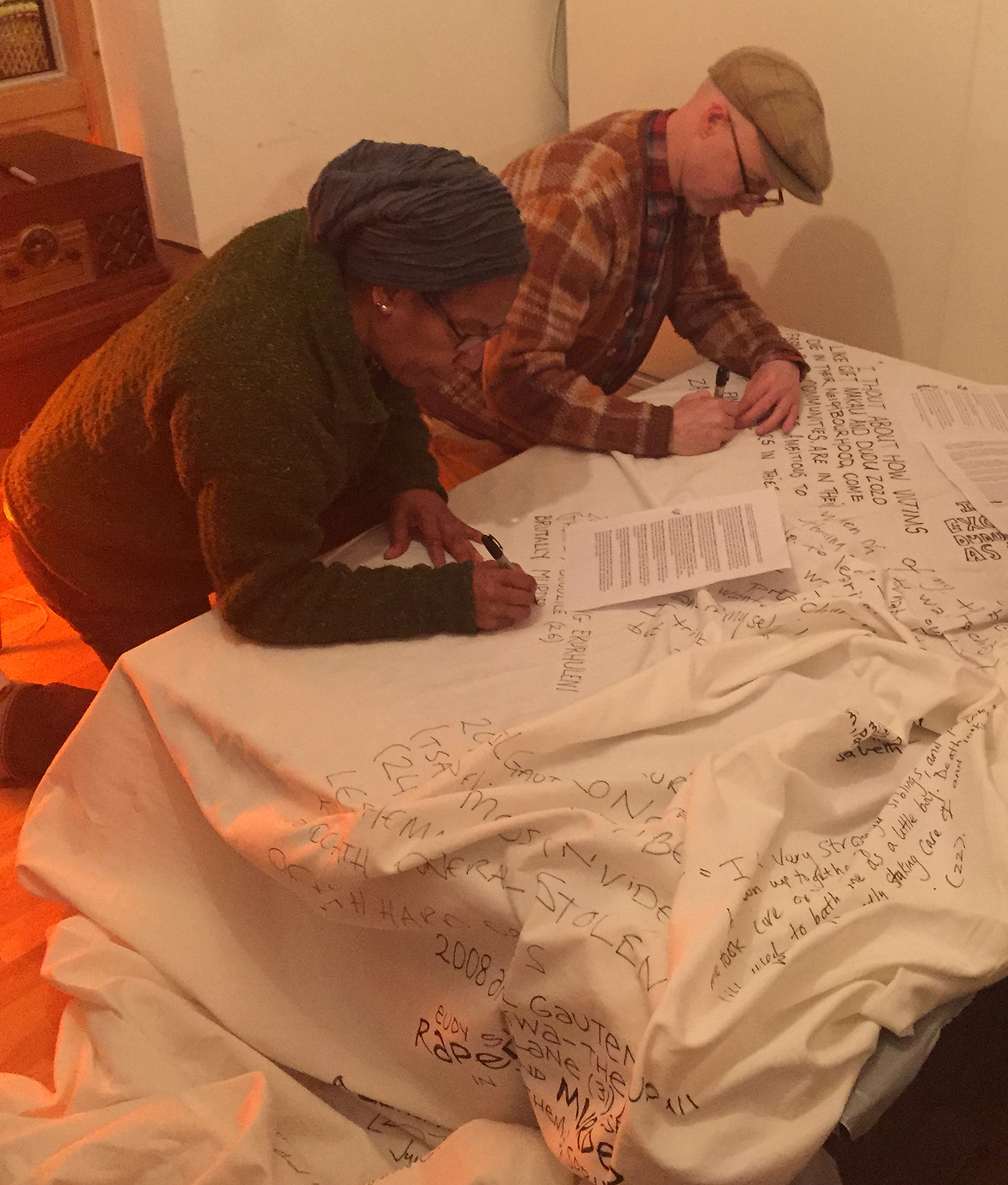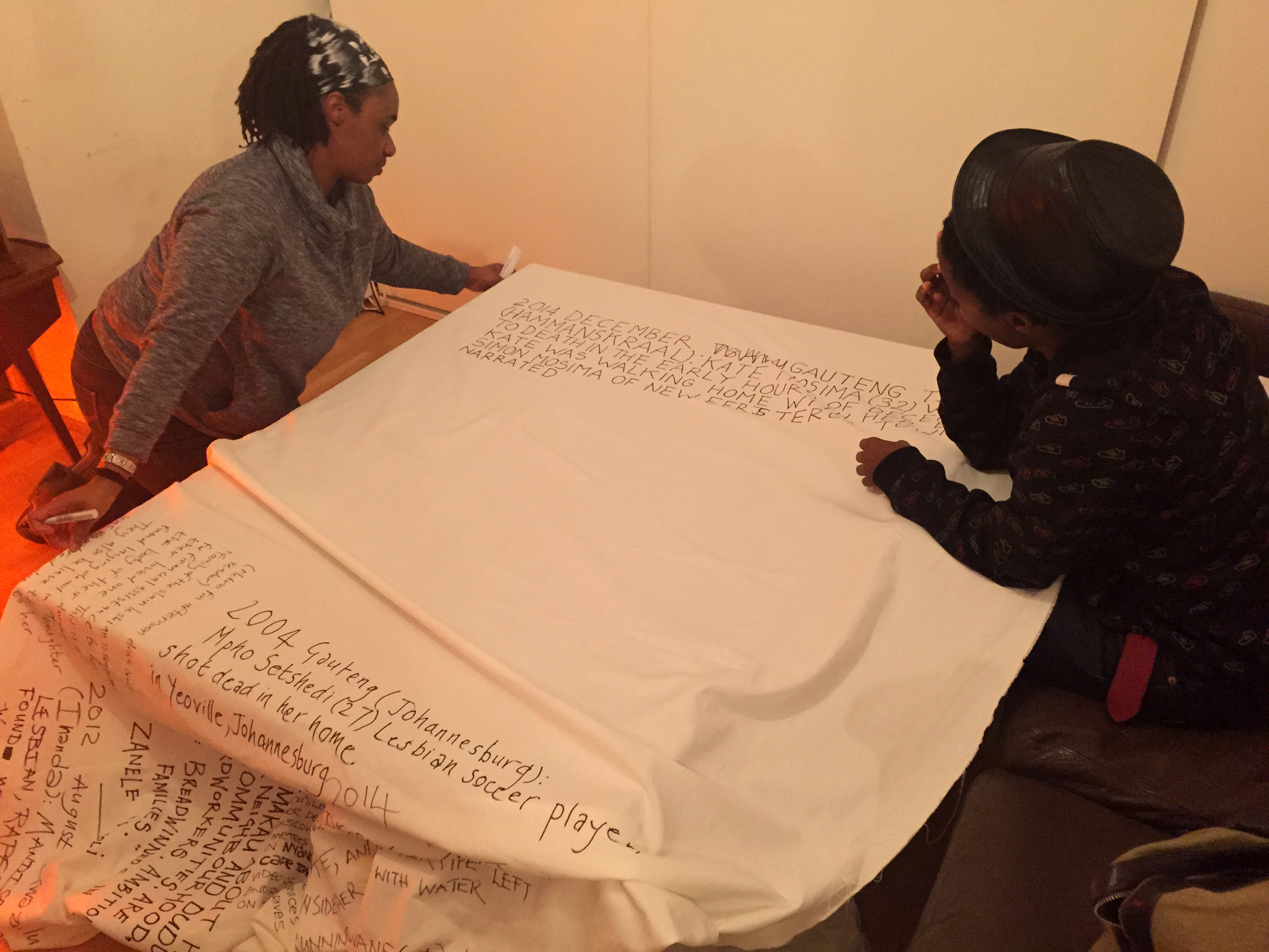 Muholi explained to the eager group that their participation forms part of an intervention into the issues affecting mostly black lesbians. It was also explained that the cloth would be hung next to the black and portraits of lesbians and transgender people who are participants in the lifetime Faces and Phases series. Muholi gave a special mention to the veterans in the group including photographer’s Ingrid Pollard and Robert Taylor, thanking them for their visibility and the work they have done in the years that they have worked in the art industry.