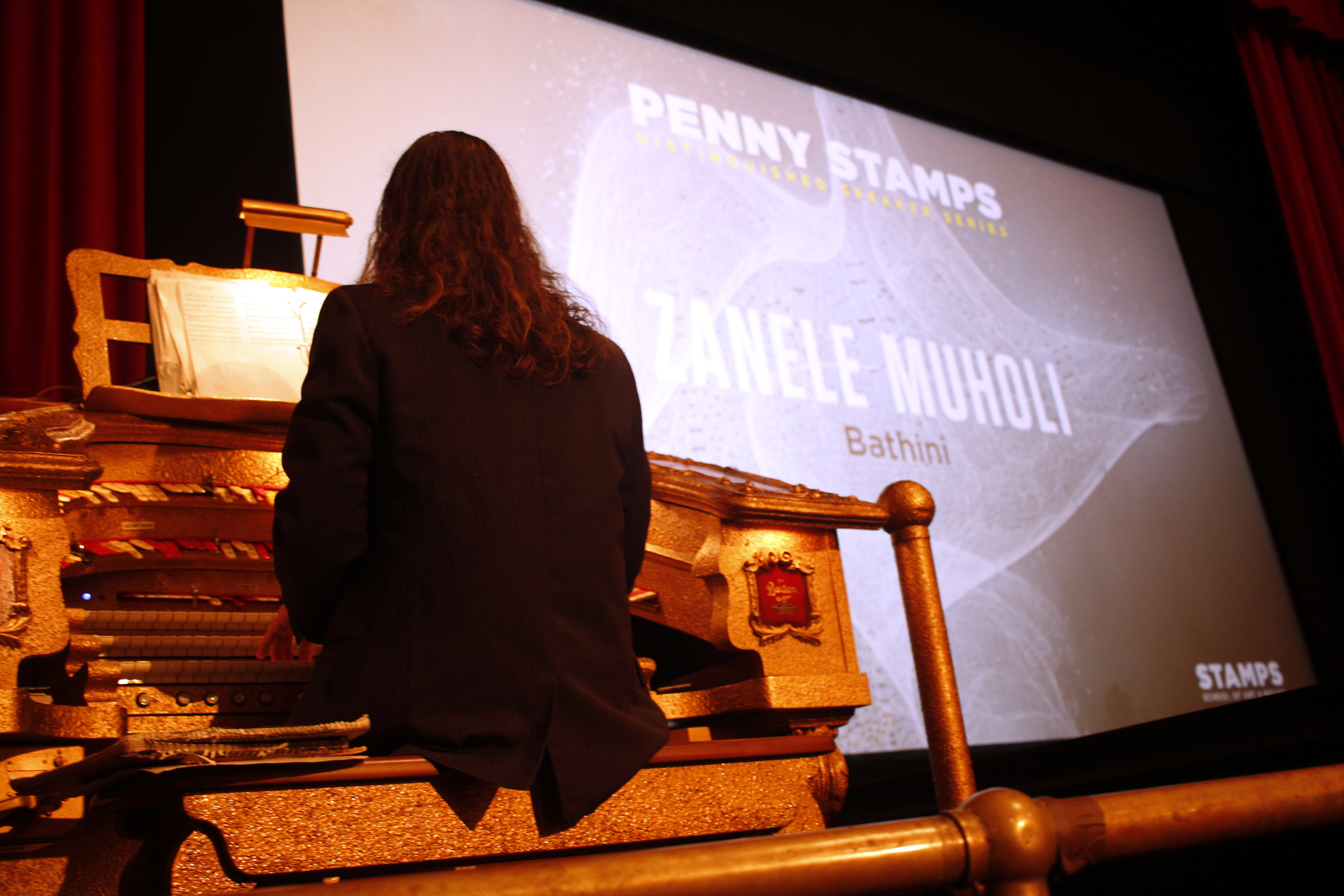 True to its name and nickname of “Tree Town”, I watched through the hotel window, as trees moved violently in the direction of the wind. I packed my equipment bag, ready to walk to Michigan Theatre, where the event was to be held. Muholi was already there and had completed the technical setup; I also found a good spot to document the talk. About an hour before the presentation started, Stephen Warner, who works as a staff organist at the Theatre started playing music on the Barton Theatre Pipe Organ.