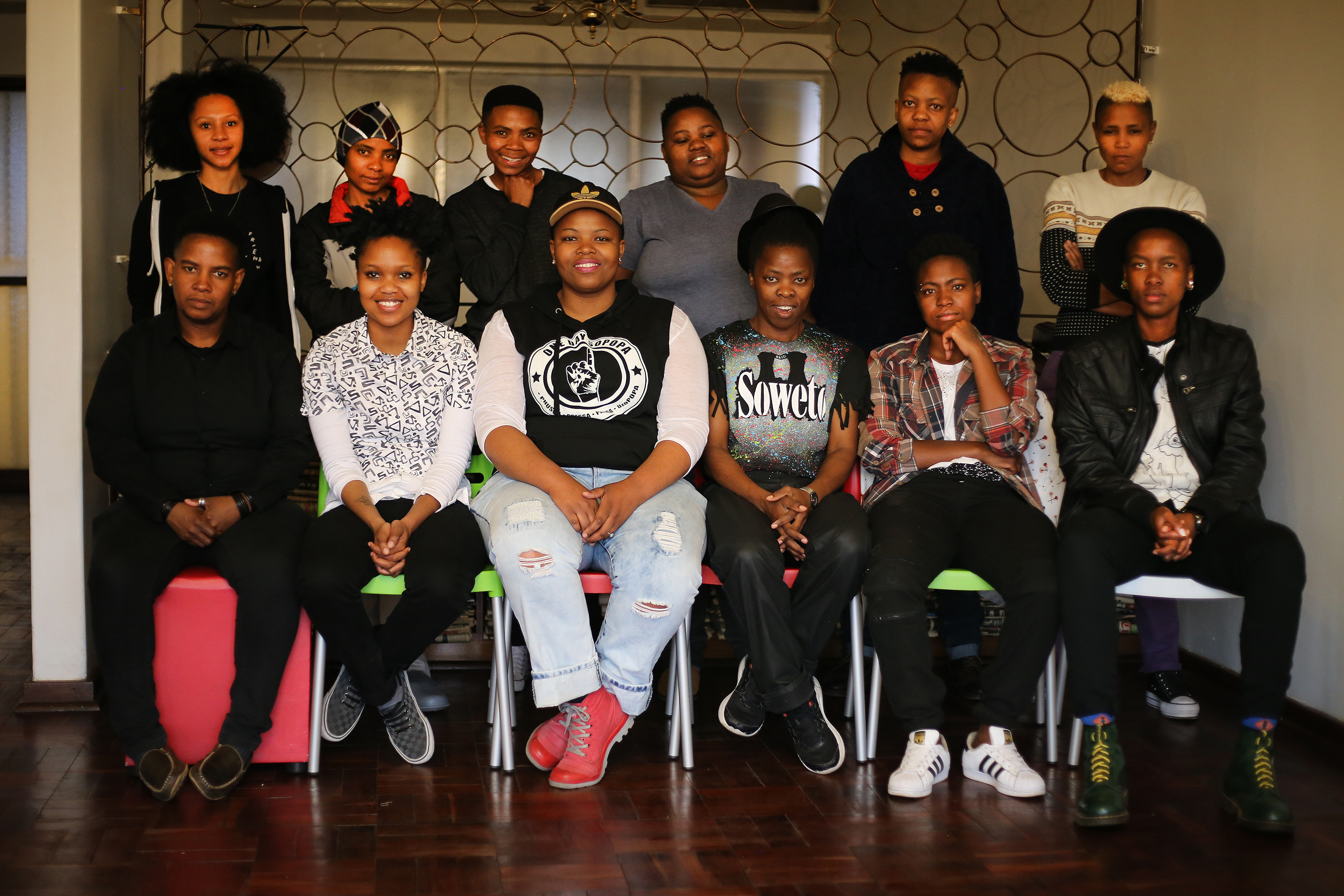 In Parktown with Faces and Phases participants and friends. Back row: L-R: Stefanie Jason, Lerato Dumse, Spola Solundwana, Sade Langa, Lebo and Terra Dick Front row: L-R: Phumzile Nkosi, Rene Mathibe, Sebe Langa, Muholi Muholi, Collen Mfazwe and Lesego Masilela